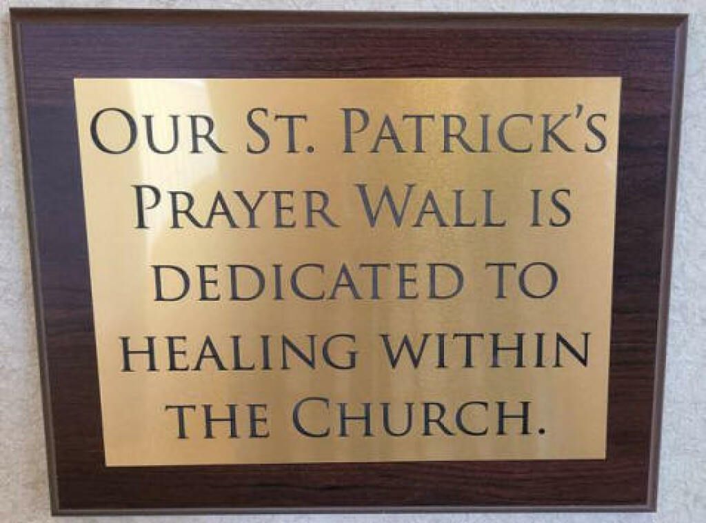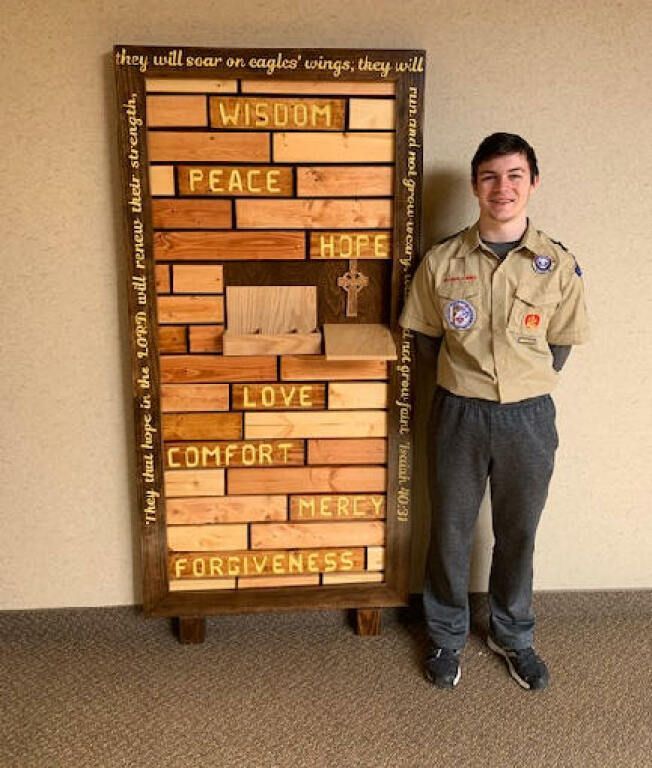 During the summer of 2019, a parishioner, Riley Kane, approached St. Patrick’s Church looking to work with parish leadership on a project to attain an Eagle Scout award with his local Boy Scout troop. After discussion with leadership, Bryan Collins met with Riley and his dad, Ryan. At this meeting ideas from the parish leadership were presented to Riley. One idea was a prayer wall similar to a Eagle Project from a neighboring parish. Riley liked the idea and a proposal was submitted back to parish leadership. After discussion among parish leaders, a Prayer Wall dedicated to healing was approved to be installed.